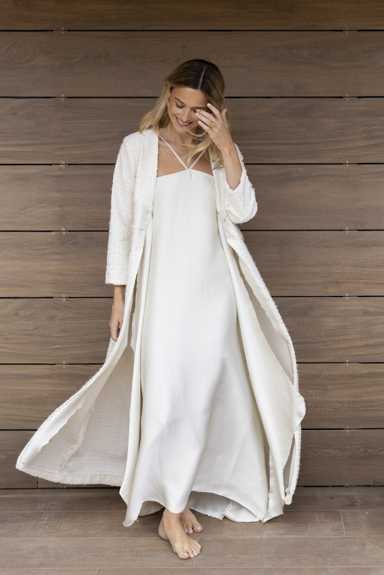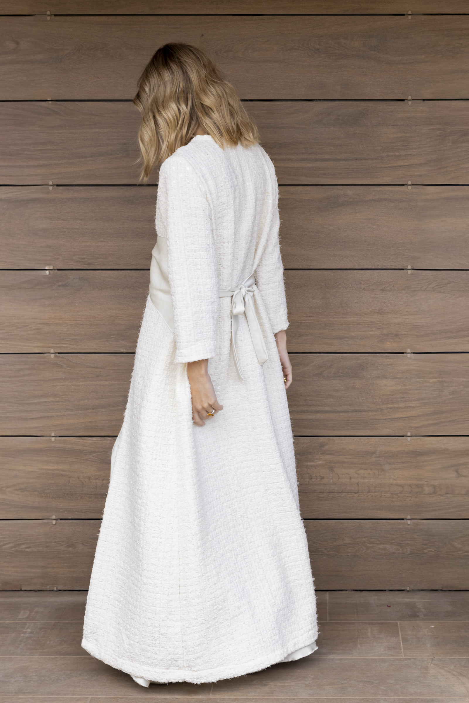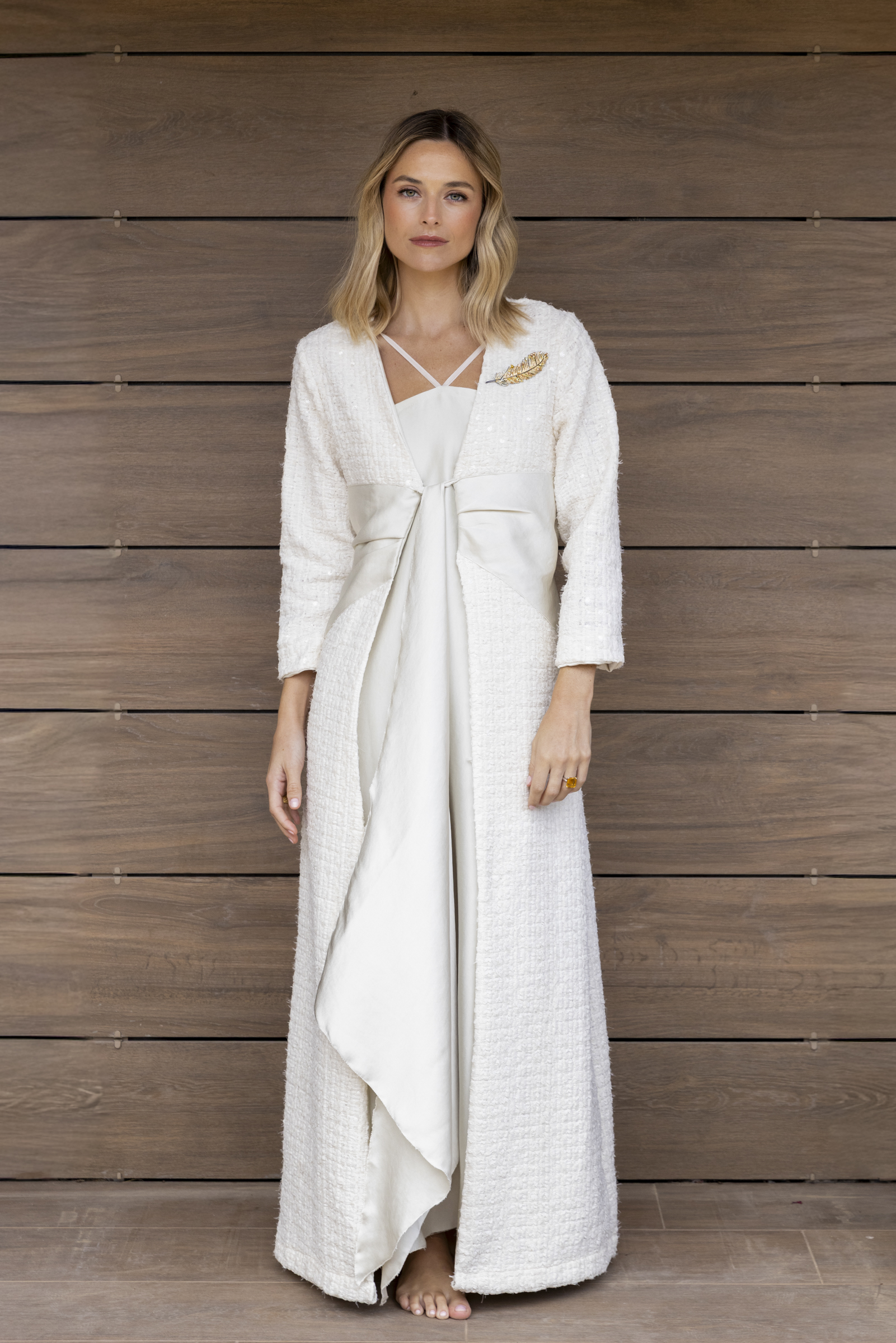 Exclusiva y luminosa, esta bata está realizada en un tweed de tul bordado con delicadas lentejuelas en tono marfil, que aportan brillo sutil y sofisticación.