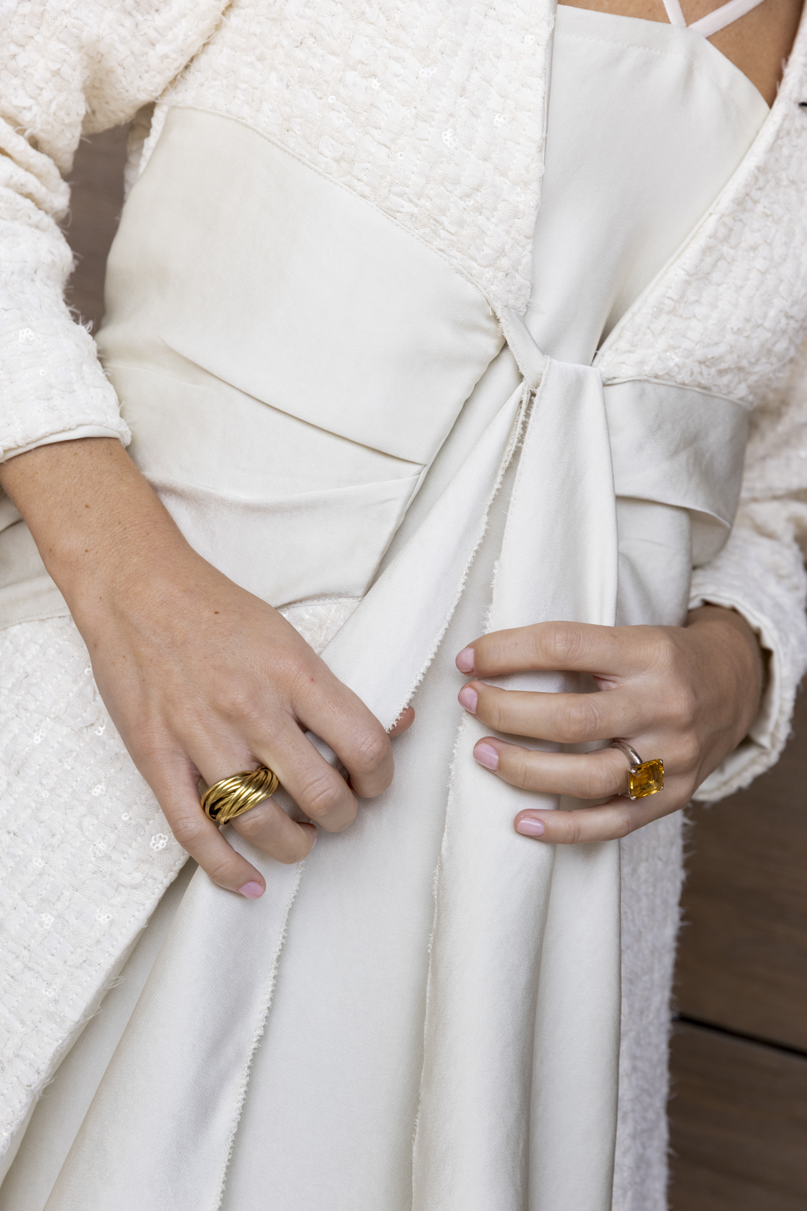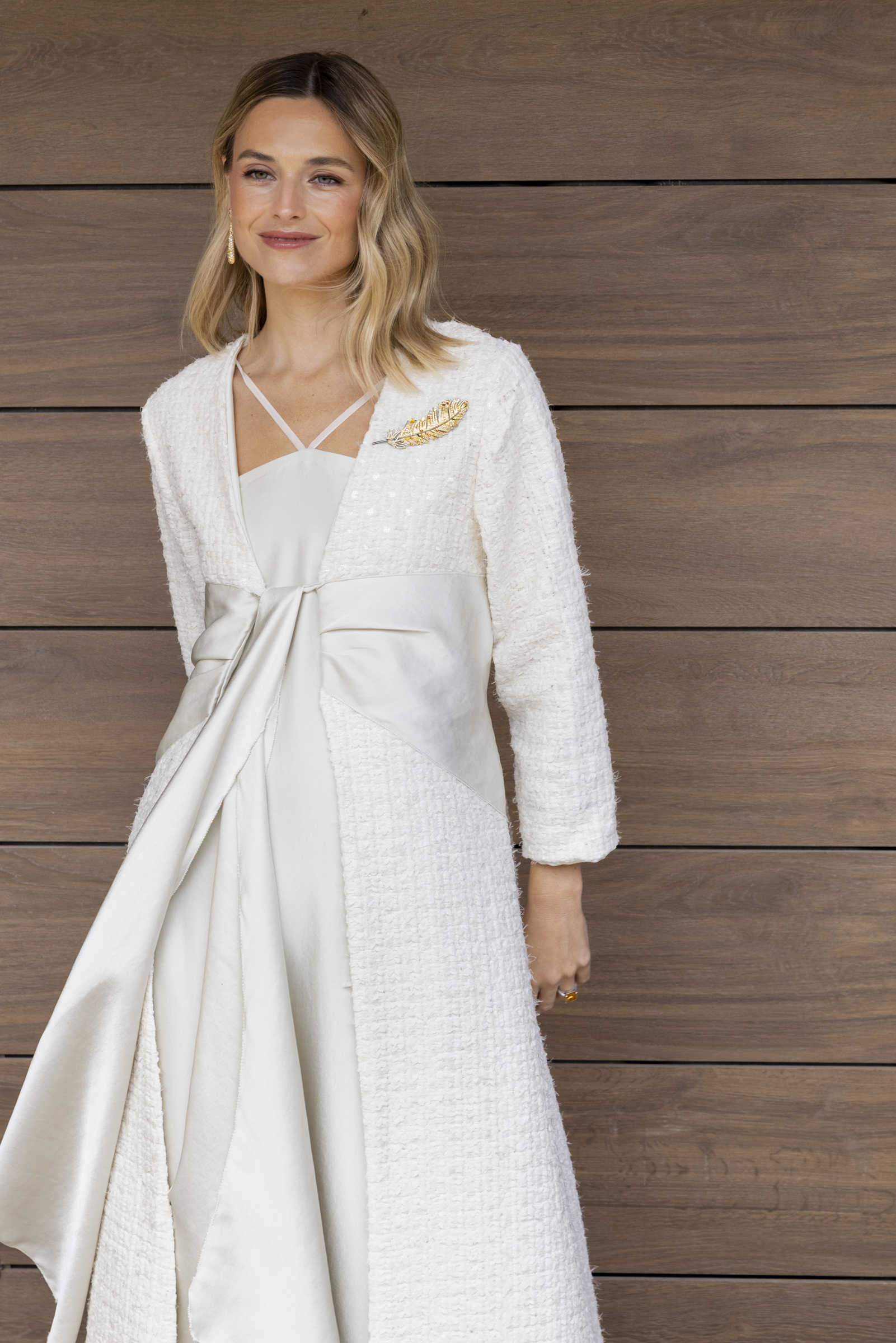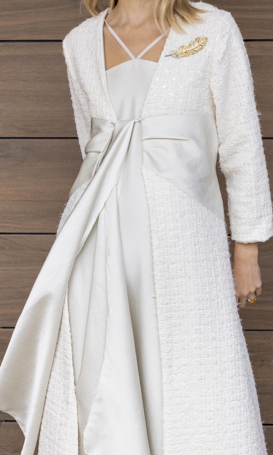 Exclusiva y luminosa, esta bata está realizada en un tweed de tul bordado con delicadas lentejuelas en tono marfil, que aportan brillo sutil y sofisticación.
