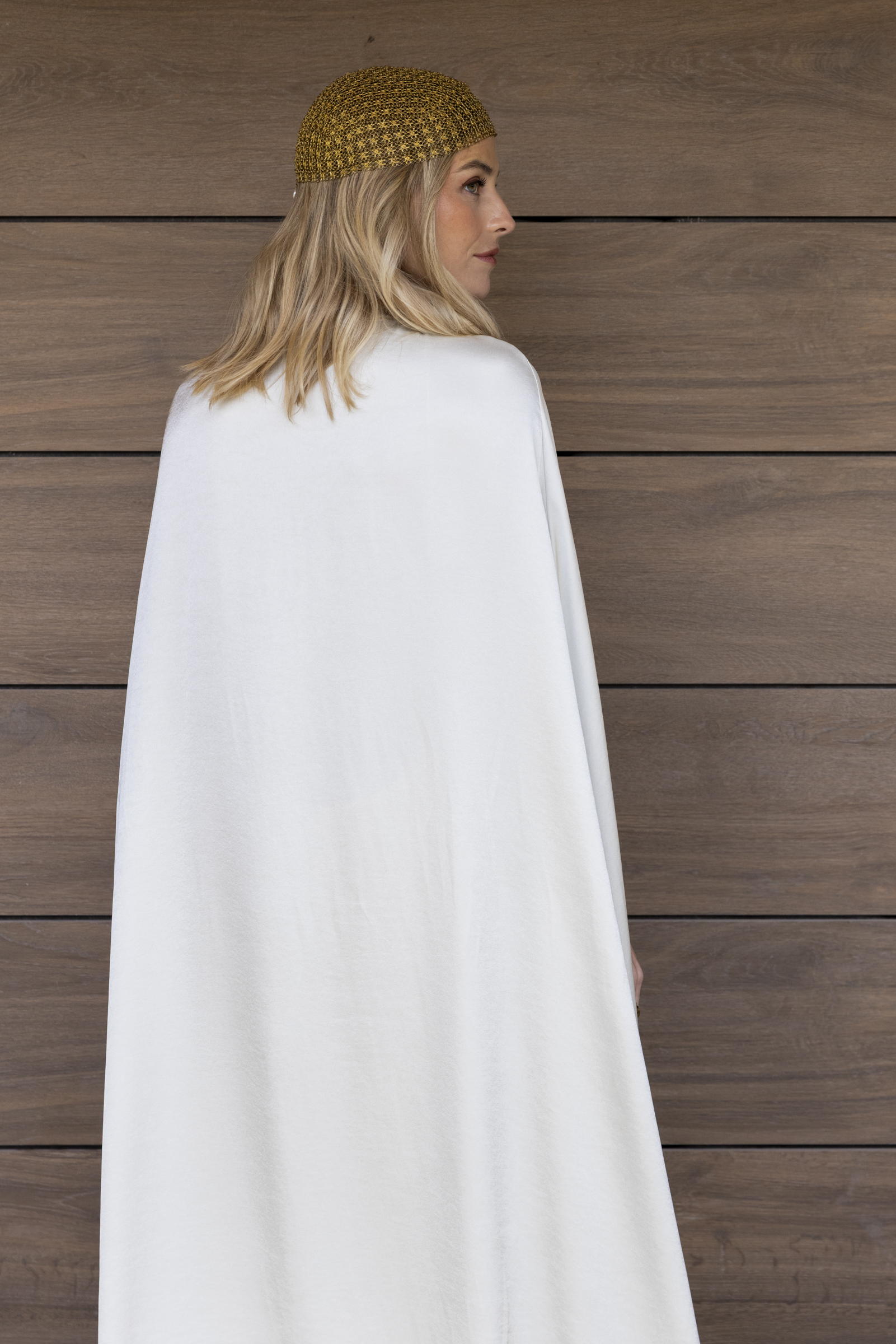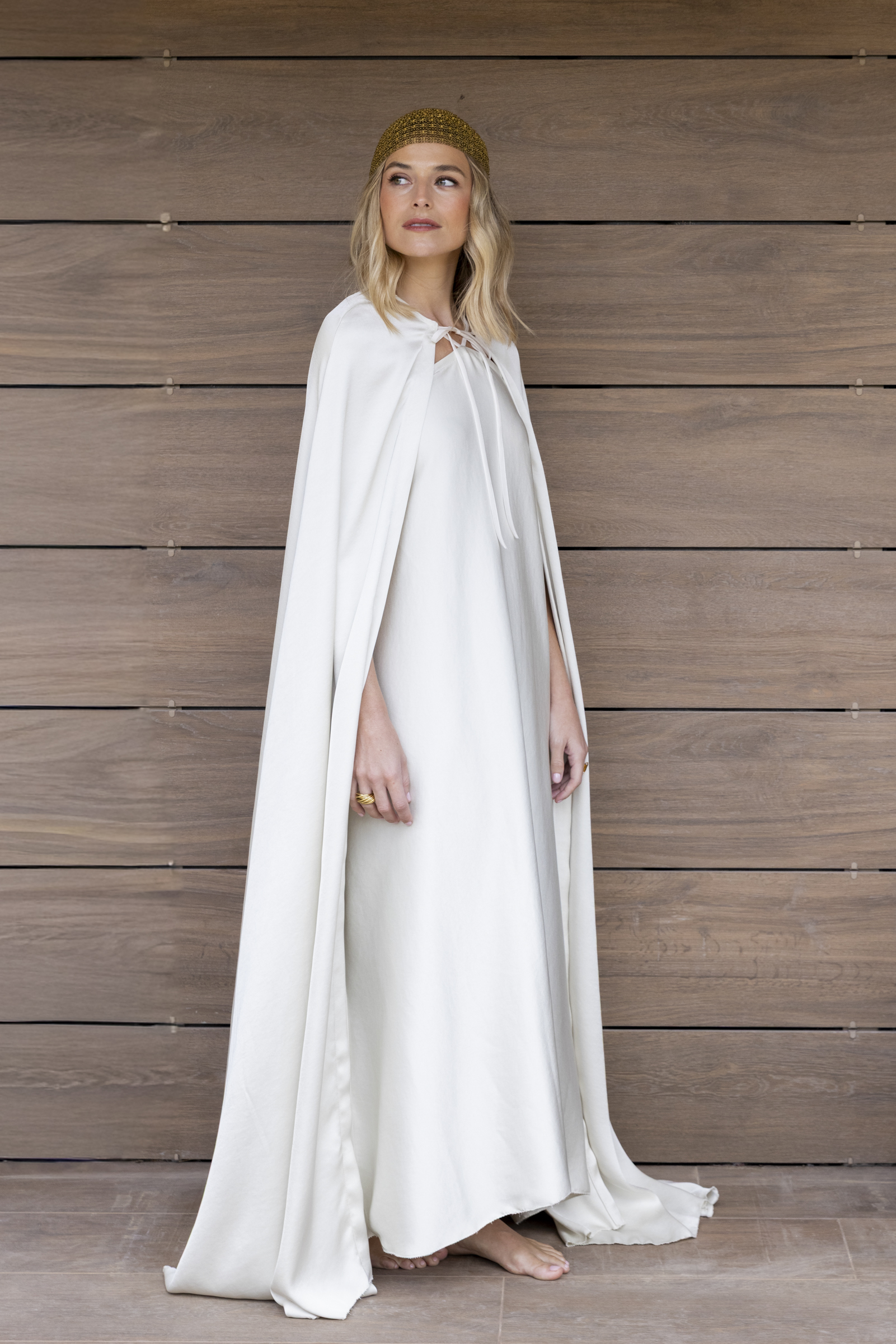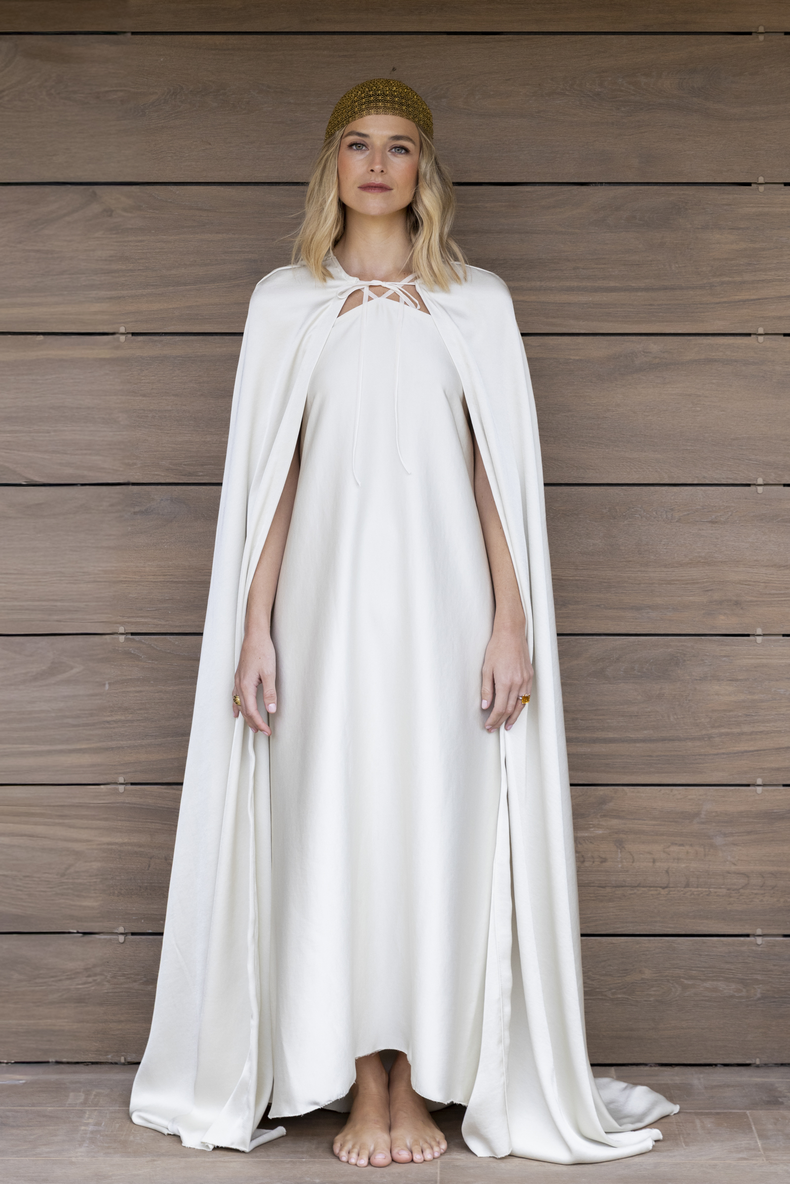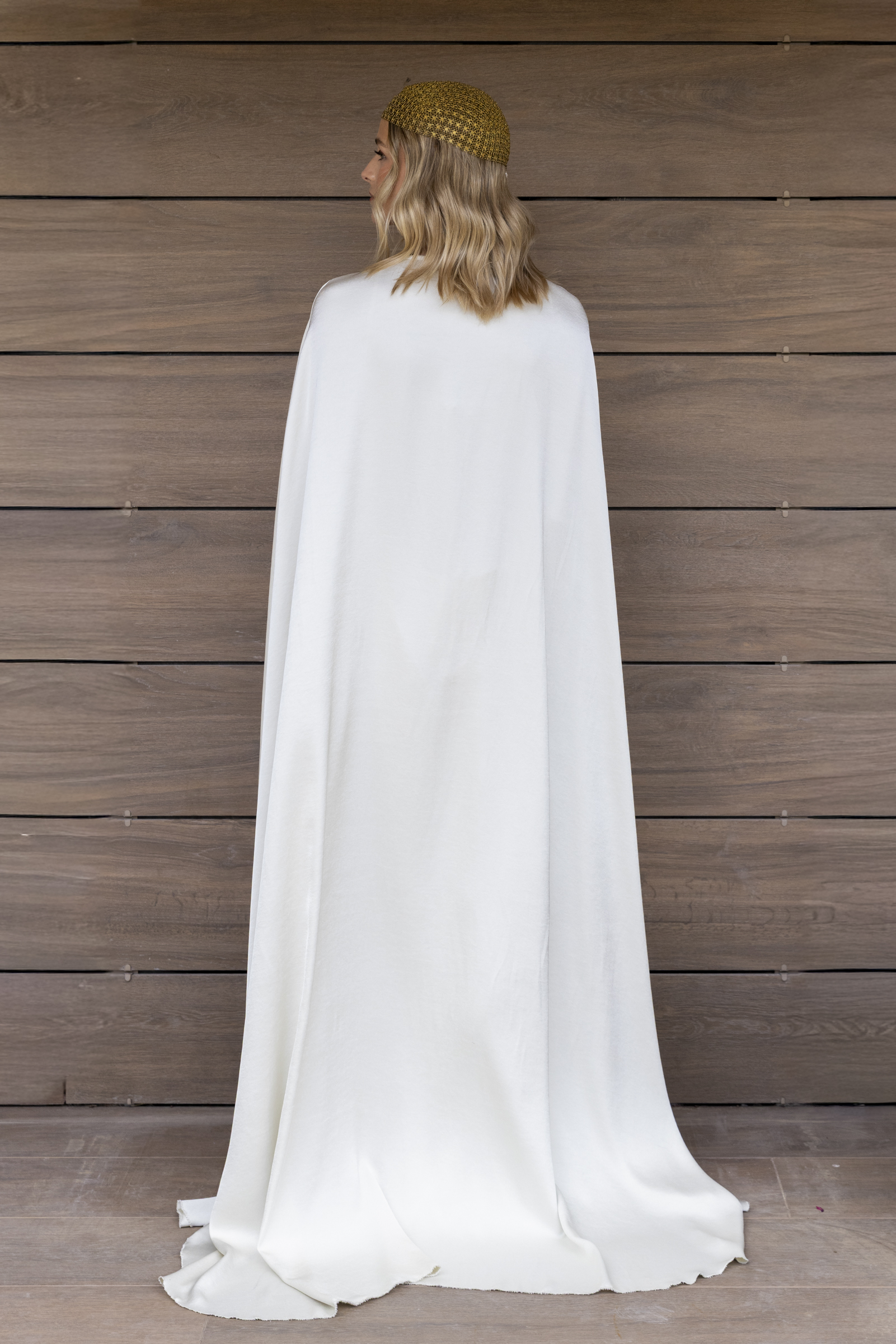 Su diseño con forma de capa, cortado al bies para aportar fluidez y movimiento, se cierra con una lazada en el cuello que realza su aire romántico.