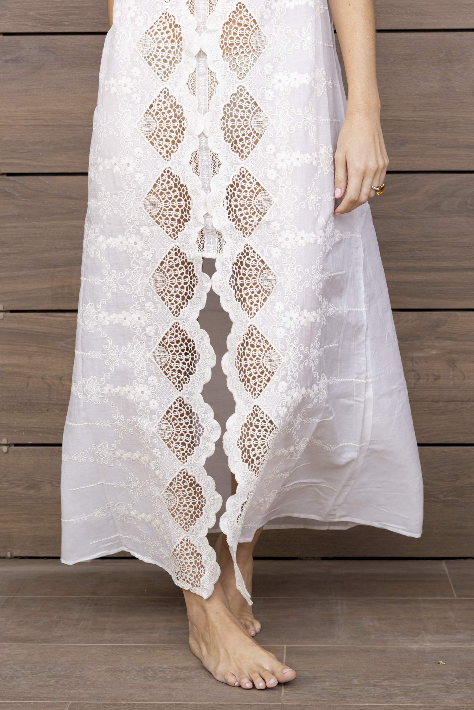 Camisón largo confeccionado en seda bordada con dibujo de rombos, unida en el centro mediante una tira bordada a modo de entredós que recorre toda la prenda desde el escote hasta el bajo.