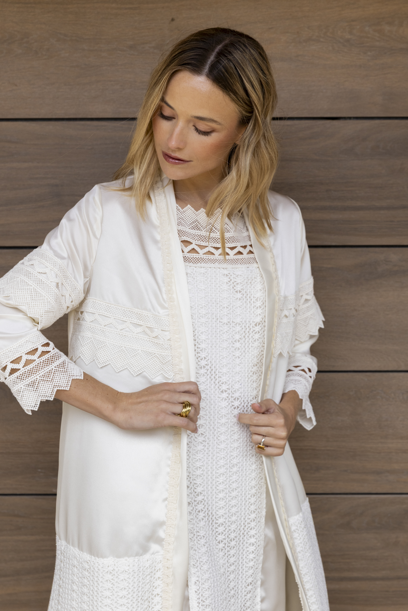 Camisón confeccionado en suave raso color crudo, con un delicado cuello halter bordado y un frontal adornado con bordado en algodón que realza su elegancia. Los laterales con tira bordada y pequeñas aperturas aportan ligereza y movimiento, mientras que los tirantes de bordado en algodón completan el diseño con un toque artesanal y romántico.